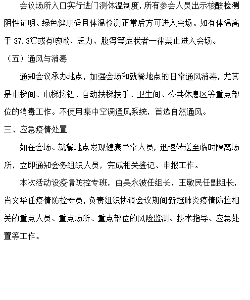 本次活动设疫情防控专班,由吴永波任组长,王敬民任副组长,肖文华任疫情防控专员,负责组织协调会议期间新冠肺炎疫情防控相关的重点人员、重点场所、重点部位的风险监测、技术指导、应急处置等工作。具体防控方案经常务理事表决通过后公示如下。