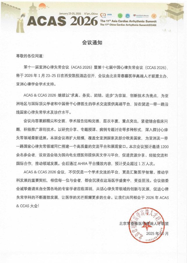 第十一届亚洲心律失常会议(ACAS2026)暨第十七届中国心律失常会议(CCAS 2026)会议通知
